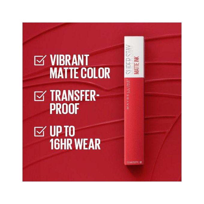 Maybelline SuperStay Matte Ink Liquid Lipstick 20 Pioneer is a long-lasting, high-impact liquid lipstick that provides a flawless matte finish. It’s designed to deliver vibrant color and up to 16 hours of wear. Offers a bold, rich red shade and Delivers a smooth, matte finish without drying out the lips.